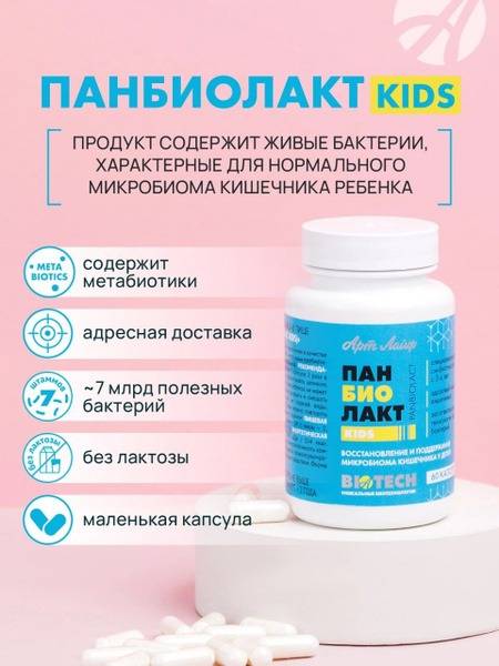 Panbiolact Kids, probiotic, children's probiotic, gut health, children's gut health, probiotics for kids, prebiotics, metabiotics, bifidobacteria, lactobacteria, immune system, digestive health, allergy relief, infection prevention, vitamins, dairy-free, lactose-free, milk protein free, GMO-free, gluten-free, ArtLife, Kazakhstan, child health supplements, children's supplements, healthy gut, digestive support, immune support