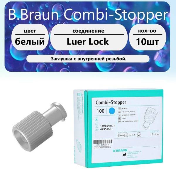 Sterile B. Braun Combi-Stopper infusion port caps (10 pieces) feature Luer-lock connections with internal and external threads. Made from polyethylene, these caps are suitable for all types of open ports in infusion systems and pre-filled syringes.