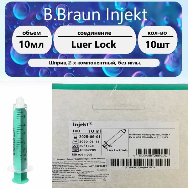 B.Braun, Injekt, syringe, 10ml, 10cc, 2-part syringe, luer-lock, needleless syringe, disposable syringe, medical syringe, polypropylene syringe, polyethylene syringe, precise dosing, extended graduation, ISO 7886-1, healthcare supplies, pharmaceutical supplies, medical equipment, bulk syringes, green plunger, color-coded packaging.