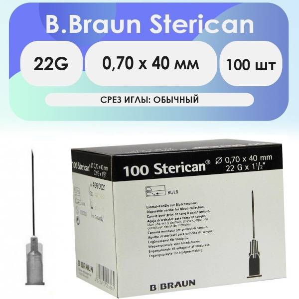B. Braun, Sterican, 22G, injection needle, needles, 0.7mm, 40mm, sterile, single-use, Luer-lock, polypropylene, stainless steel, silicone coated, triple bevel, medical supplies, healthcare, disposable needles, injection, puncture, ISO 7864, DIN 13097, ISO 6009, color-coded, black, box of 100, medical device