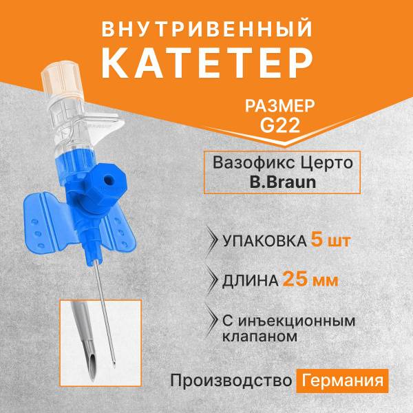 The B.Braun Vasofix Certo G22 IV catheter (0.9 x 25mm) is a polyurethane, latex-free, and PVC-free catheter featuring an injection port for needleless injections, minimizing the risk of needle sticks and promoting prolonged use. Its specialized needle tip reduces puncture trauma, while the transparent cannula allows for easy verification of successful venipuncture.