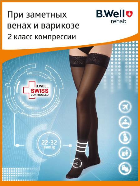 Keywords: Compression stockings, compression socks, medical compression stockings, 20-30 mmHg compression, Class 2 compression stockings, B.Well, varicose veins, spider veins, leg swelling, chronic venous insufficiency, pregnancy leg pain, Swiss-made, Oeko-Tex certified, breathable, comfortable, durable, elegant, lace top, sheer toe, size chart, women's compression stockings, anti-embolic stockings, HATRA certified.