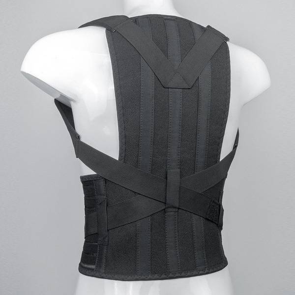 The PR-413 semi-rigid reclining orthopedic corset provides controlled fixation and unloading of the upper thoracic vertebrae while maintaining and restoring normal muscle tone. Recommended for posture correction, rehabilitation after upper and mid-thoracic spine and clavicle injuries and surgeries. The two stiffening ribs are non-removable. Features include non-stretchable reclining straps in soft sheaths, adjustable metal stiffening ribs, and a wide elastic waist belt with a secure closure. This corset offers semi-rigid fixation of the thoracic spine via two metal stiffening ribs and maintains the physiological position of the upper limbs using non-stretchable reclining straps.