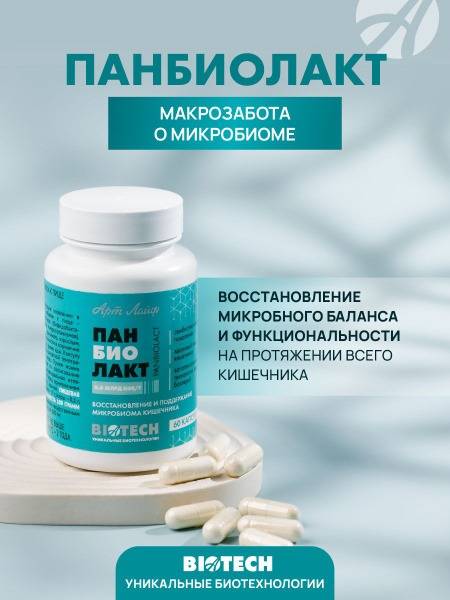 Description: Panbiolact is a dietary supplement designed to restore and maintain a healthy gut microbiome. It's formulated with a unique blend of 7 live probiotic strains (bifidobacteria, lactobacilli, and propionibacteria) totaling 5.6 billion CFU per 2 capsules. Panbiolact supports digestive health by addressing issues such as diarrhea, dyspepsia, bloating, and food poisoning. It's also beneficial for those recovering from illness (including antibiotic, hormonal, chemotherapy, or radiation therapy), managing allergies (including atopic dermatitis), and preventing travel-related digestive upsets. The dairy-free formula utilizes microencapsulation technology to protect the probiotics and enhance their survival. Its metabolic activity promotes the production of beneficial compounds, supporting overall gut health and immune function. Each capsule weighs 0.6g.