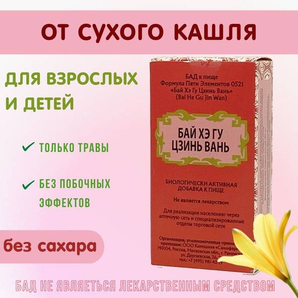 Description: Bai He Gu Jin Wan is a traditional Chinese medicine (TCM) herbal formula designed to alleviate cough and throat discomfort. If you experience a dry cough, a cough producing small amounts of thick, sticky phlegm (possibly with blood streaks), shortness of breath, dry throat pain, or hoarseness, Bai He Gu Jin Wan may offer significant relief. This comprehensive formula boasts anti-inflammatory and antibacterial properties, helping to reduce inflammation in the respiratory tract and combat potential infections. However, its primary benefit lies in its expectorant action – effectively loosening and eliminating phlegm to ease coughing and clear airways. Experience reduced inflammation, soothed cough symptoms, and improved throat comfort with Bai He Gu Jin Wan. This Five Element Formula (0521) nourishes Yin in the Lungs and Kidneys, moisturizes the Lungs, expectorates phlegm, and stops coughs. It's indicated for Yin deficiency in the Lungs and Kidneys, and for Empty Heat. Manufactured by Tai Bao. Contraindications: individual component intolerance, pregnancy, breastfeeding.
