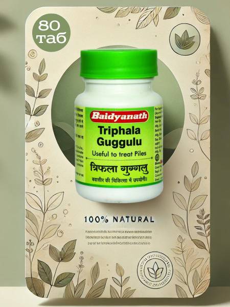 Baidyanath Triphala Guggulu (80 tablets) is an Ayurvedic supplement combining Triphala and Guggul for detoxification, joint health, cholesterol & blood sugar support, improved metabolism, and immune function.