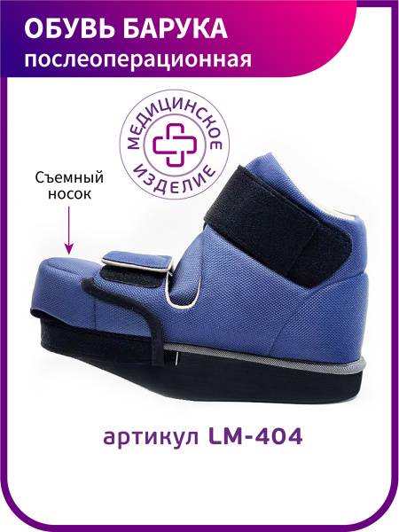 The Baruka Post-Operative Shoe LM-404 features a specially designed, multi-height sole with a shifted roll axis. This innovative design transfers weight to the unoperated heel, relieving pressure on the forefoot. Its fully-opening construction and Velcro closure allow for easy application over post-operative dressings or swollen feet. The shoe boasts durable, breathable upper materials, a removable insole for easy hygiene, and a removable toe cap to protect against dust and moisture. A robust, extended-surface sole provides enhanced stability.