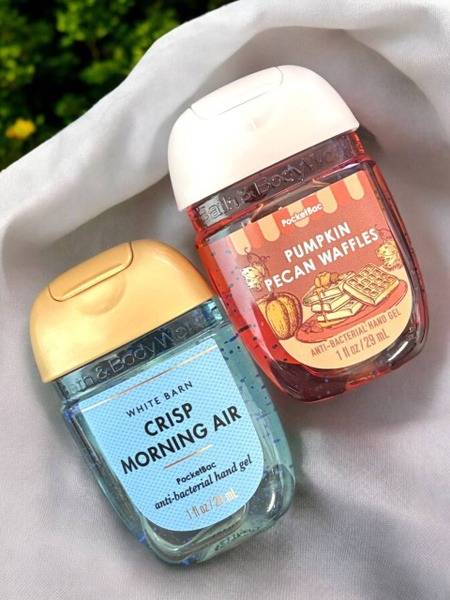 Experience the delightful duo of Bath & Body Works hand sanitizers – Crisp Morning Air and Pumpkin Pecan Waffles – each a convenient 29ml bottle. These aren't your average sanitizers; they offer effective germ protection with captivating fragrances. Crisp Morning Air invigorates with the freshness of a crisp morning, while Pumpkin Pecan Waffles envelops you in the cozy warmth of autumn spices and sweet waffles. Both formulas are enriched with moisturizing ingredients for gentle hand care, requiring no water for use anytime, anywhere. Perfect for on-the-go protection, these stylish and compact bottles easily slip into purses or pockets. Treat your hands to the ultimate blend of cleanliness and delightful scents. Choose the Bath & Body Works hand sanitizer duo for a luxurious and effective sanitizing experience.