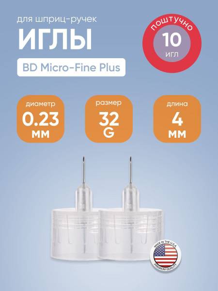 Experience virtually painless insulin injections with BD Micro-Fine Plus pen needles. These 32G (0.23mm x 4mm) needles feature triple-beveled, laser-sharpened points for minimal discomfort and a thin-walled design for smoother insulin delivery and reduced injection force. Each needle is siliconized for easier skin penetration. This 10-count box of disposable needles is compatible with most insulin pen injectors (meeting "TYPE A" EN ISO 11608-22 requirements). For home use by patients with insulin-dependent diabetes. Always consult your doctor regarding injection technique and appropriate needle length. For 4mm needles, inject at a 90-degree angle after creating a skin fold to avoid intramuscular injection. Single-use only; reuse is not recommended due to potential for contamination and damage. Ensure the individual packaging is intact before use.