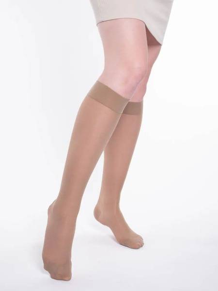 Experience superior comfort and support with our beige Class 0 compression socks for women. These preventative compression stockings are ideal for individuals with a genetic predisposition to chronic venous insufficiency, those with jobs involving static loads, frequent air travelers, pregnant women (without existing venous insufficiency), people with excess weight, flat feet, or those engaging in strenuous physical activity.