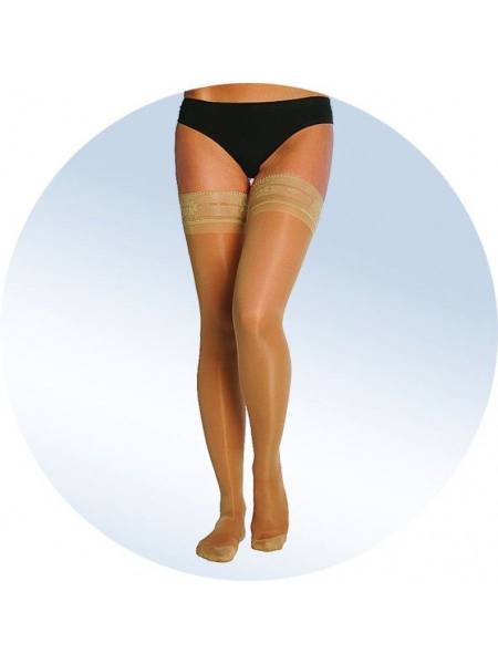 These semi-sheer beige compression stockings provide moderate 20-30 mmHg compression throughout the leg, offering gentle support and promoting healthy circulation. Designed for women, they are ideal for various needs and lifestyles.