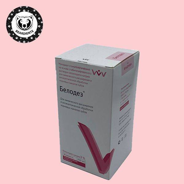 Discover Belodez 3% Gel (250ml) by VladMiva, a premium stabilized sodium hypochlorite solution designed for superior dental applications. This advanced antiseptic effectively dissolves organic dentin, targeting both vital (chemically fixed) and necrotic tissues. Its unique gel formulation ensures optimal viscosity and flow, making it ideal for antiseptic treatment of upper jaw tooth cavities with minimal mucosal irritation.
