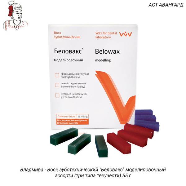 Keywords: Belovaks, dental wax, modeling wax, lost wax casting, dental laboratory, inlay wax, crown wax, bridge wax, high flow wax, medium flow wax, low flow wax, dental materials, dental supplies, 55g, red wax, blue wax, green wax, dental prosthetics, partial denture, full cast restoration.