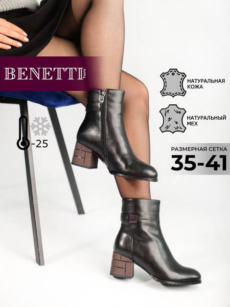 BENETTI women's winter ankle boots are the perfect choice for the active woman. These stylish black boots boast a classic design crafted from high-quality materials: genuine leather uppers with a warm, thick natural fur lining. This durable and long-lasting combination ensures exceptional warmth and protection against harsh winter conditions. Easy to care for, these leather Chelsea boots feature a chunky, textured sole providing superior grip on any surface. With a mid-height heel, these versatile boots are a modern wardrobe staple. Whether you're looking for Chelsea boots, stylish ankle boots, or a durable alternative to combat boots, these BENETTI boots offer the perfect blend of fashion, comfort, and practicality. Ideal for everyday wear, outdoor adventures, office work, or driving, these black women's boots effortlessly pair with a puffer jacket, parka, or any winter outfit.