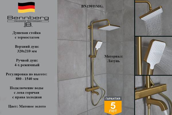 Experience the ultimate showering indulgence with the Bennberg BN19011MG matte gold thermostatic shower system. This elegant wall-mounted unit transforms your bathroom into a private oasis, combining sophisticated design with exceptional functionality.