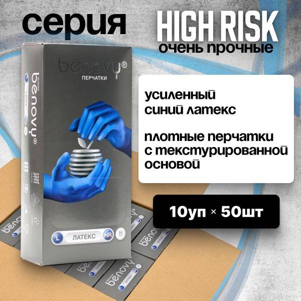 Benovy Latex High-Risk gloves offer superior strength and protection. Their increased thickness, textured surface, and enhanced puncture resistance make them ideal for high-infection-risk procedures and situations where the risk of glove damage is significant. These gloves meet Russian (GOST) and international standards for tensile strength and mechanical durability. Made from natural rubber latex (may cause allergic reactions). While providing excellent protection, these gloves do not guarantee 100% protection against punctures or cuts.