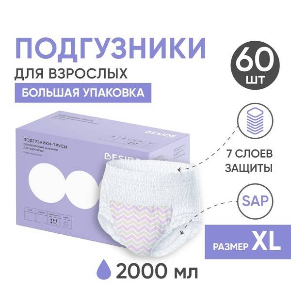 Keywords: adult diapers, adult diaper underwear, incontinence briefs, disposable diapers, adult incontinence products, absorbent diapers, high absorbency diapers, elderly care, disability care, postpartum care, urinary incontinence, leak proof diapers, comfortable diapers, BESIDE diapers, XL diapers, 60 count diapers, disposable underwear, gel core diapers, super absorbent diapers, zigzag pattern, tear away sides, wetness indicator.
