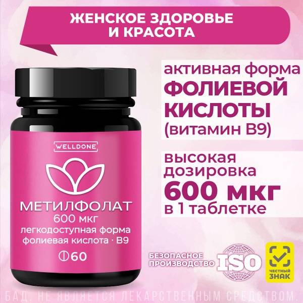 Keywords: Methylfolate, L-methylfolate, folic acid, vitamin B9, vitamin B9 supplement, women's health supplement, pregnancy supplement, prenatal vitamin, MTHFR support, homocysteine, PMS relief, menopause relief, bioavailable folate, active folate, healthy hair, healthy skin, cognitive function, cardiovascular health, digestive health, Welldone, 600 mcg, 60 tablets