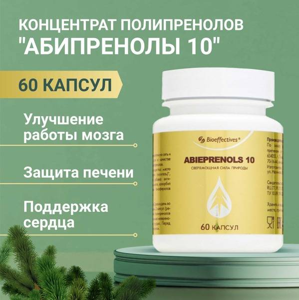 Bioeffective Abiprenols 10 is a potent natural immunomodulator and adaptogen, offering broad-spectrum support for your body's defenses. This supplement, sourced from pine needles – one of nature's richest sources of polyphenols – helps boost your immune response during viral and infectious illnesses. It supports the normalization of endocrine gland function, stimulates the production of interferon, and aids in detoxification. Abiprenols 10 works by repairing damaged cells, promoting the generation of new ones, and protecting vital organs including the liver, heart, and brain. A dietary supplement providing a rich source of polyphenols.