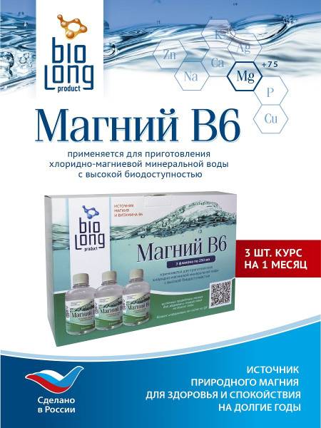 Biolong Magnesium B6 is a highly bioavailable liquid mineral complex designed for convenient daily intake. Each 250ml bottle provides a 10-day supply of this essential nutrient blend. This chloride-magnesium mineral water solution is a rich source of natural magnesium, along with potassium, calcium, sodium, bromine, boron, selenium, zinc, manganese, phosphorus, copper, molybdenum, germanium, silicon, and silver. The magnesium is in chelate form for optimal absorption.