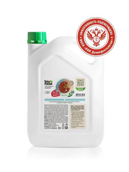 Bioneat "STOP-VIRUS" is a professional-grade eco-disinfectant suitable for various applications, ensuring 100% hygiene and sterilization. Its broad-spectrum action effectively eliminates a wide range of bacteria and viruses, including COVID-19, Hepatitis, Tuberculosis, Herpes, URTI, Influenza, Papillomaviruses, Rotavirus, and other pathogens. For air purification, add to humidifiers or air purifiers (1:20 dilution – 200ml Bioneat per 4.5L water). This versatile antiseptic also neutralizes odors and spores from various surfaces. It provides antifungal action on shoes and floors, preventing fungal infections like athlete's foot and nail fungus. Suitable for sterilizing manicure tools at home and disinfecting medical chairs and furniture in the beauty industry. Its versatility reduces cleaning product costs. Despite the 3L size, Bioneat's economical use ensures long-lasting effectiveness. Bioneat "STOP-VIRUS" – your reliable partner in fighting infections and contamination.