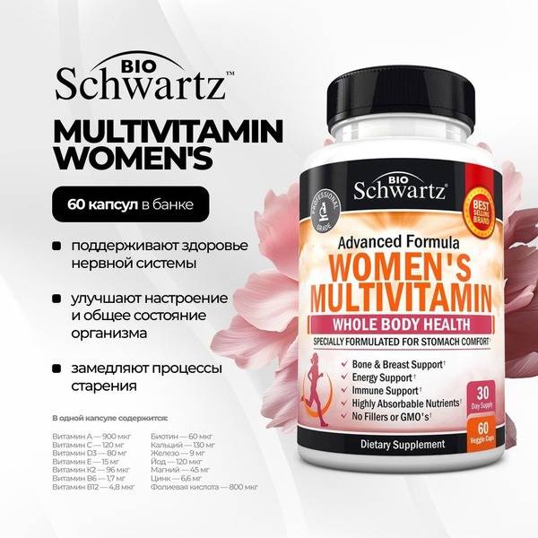 Keywords: BioSchwartz, women's multivitamin, women's health supplements, vitamins for women, minerals for women, vitamin D3, calcium, magnesium, biotin, iron, zinc, vitamin C, vitamin A, B vitamins, bone health, reproductive health, immune support, energy boost, stress relief, skin health, hair health, American supplement brand, dietary supplement, daily vitamins, BioSchwartz Women's Multivitamin 60 capsules