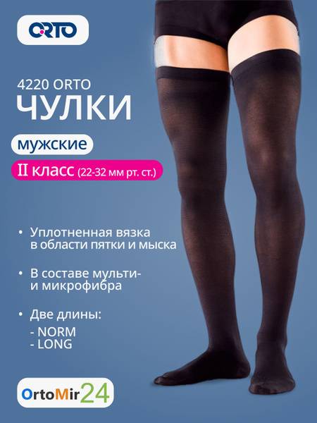ORTO compression stockings, men's compression stockings, Class 2 compression stockings, 23-32 mmHg compression stockings, varicose veins, thrombophlebitis, venous edema, post-surgical recovery, graduated compression, black compression stockings, NORM length, LONG length, medical compression stockings, compression socks for men.