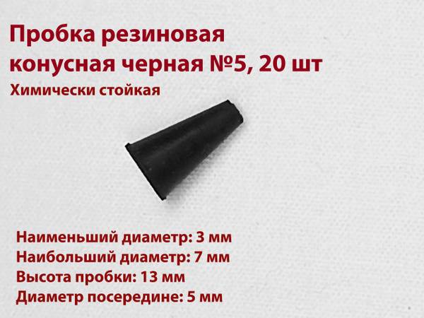 These high-quality, black rubber conical stoppers (20 pack) are ideal for sealing flasks, test tubes, jars, and other laboratory glassware. Each stopper measures 13mm in height, with a larger diameter of 7mm and a smaller diameter of 3mm. The center diameter is 5mm. Manufactured from a chemically and thermally resistant rubber compound (GOST 7852-76, 23-6-3), these stoppers are durable and reliable. Please note: These stoppers have a characteristic rubber odor; consider this when using them for non-laboratory applications.