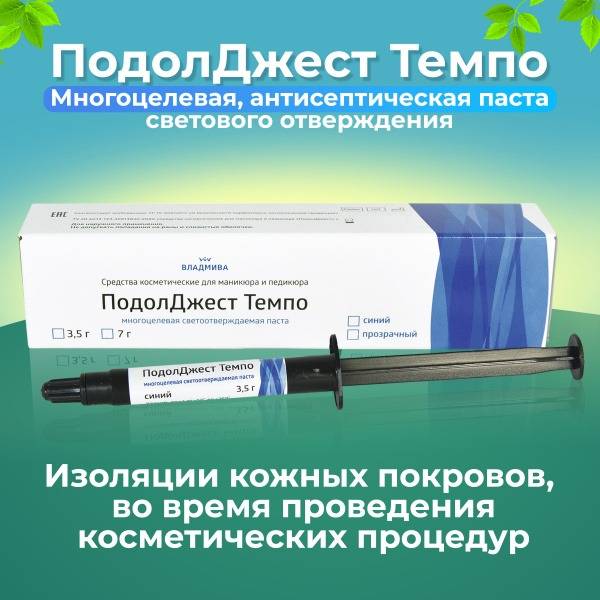 The VladMiVa PodolDzhest Temipo blue isolation paste is a professionalāgrade skin barrier designed for use during procedures such as wart removal, corn and callus treatment, nail plate modeling, and fixation of corrective systems. Applied to a prepared area and cured with a UV/LED lamp (450ā500āÆnm) for 20ā40āÆseconds, it forms an elastic, durable film that protects surrounding tissue.