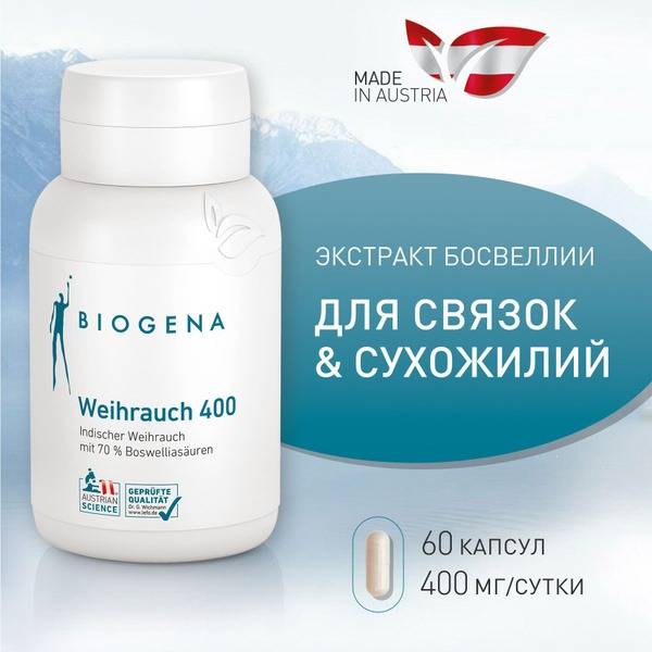Biogena Boswellia 400 is a dietary supplement formulated with Boswellia serrata extract, a natural ingredient traditionally used for its anti-inflammatory properties. This product contains a patented extract with elevated levels of terpenoid b-boswellic acids, which modern research suggests may support joint and ligament health. As a non-medicinal supplement, it is designed for adults seeking natural support for inflammatory conditions affecting joints, ligaments, and tendons.