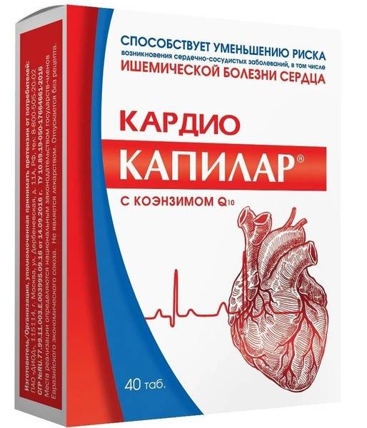 Description: Capilar Cardio is a dietary supplement designed to support cardiovascular health, improve circulation, and promote healthy blood flow. Its formula, including Coenzyme Q10 ("the youth vitamin"), selenium, vitamin C, and dihydroquercetin, helps to nourish the heart muscle and improve oxygen delivery to ischemic areas. Clinical studies have shown an increase in red blood cells, enhancing oxygen transport throughout the body. Before starting any preventative treatment, consult your physician. Contraindications include allergies to any of the ingredients. Adults should take 1 tablet three times daily with meals for a one-month course. The course may be repeated for ongoing support.