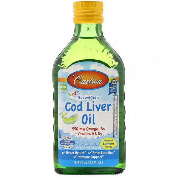 Support your child's heart health, brain function, and immune system with Carlson's premium Norwegian Cod Liver Oil. This delicious lemon-flavored supplement is gluten-free and contains no artificial preservatives. A rich source of Omega-3 DHA and EPA. Perfect for kids. 250ml bottle.