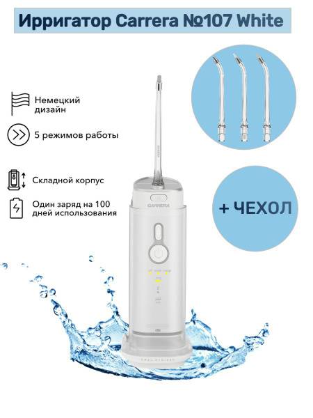 Description: The Carrera 107 portable water flosser in sleek white is your on-the-go solution for a healthier smile. Its compact, foldable design makes it perfect for travel and convenient storage. Enjoy superior oral hygiene with its five cleaning modes ranging from gentle to intense gum massage, three included nozzles (standard, orthodontic, and gum care), and a hygienic, surgical-grade stainless steel tip. The 200ml reservoir provides ample water capacity for thorough cleaning without constant refills. Experience the Carrera 107 – healthy, fresh breath anywhere, anytime.
