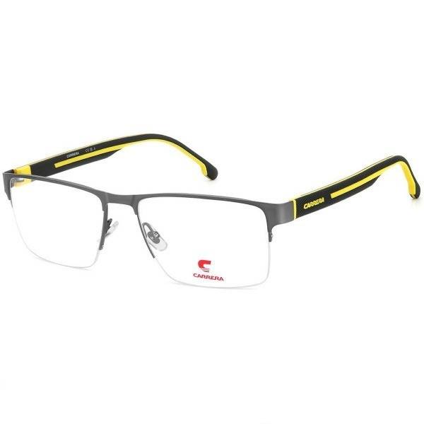Experience sophisticated style with the Carrera 8893 FMR men's sunglasses. These half-rim, rimless sunglasses feature a sleek dark gray metal frame accented by matte black temples with striking yellow accents. Crafted from lightweight yet durable stainless steel, the Carrera 8893 offers unparalleled comfort and exceptional durability. The innovative rimless lower frame design, secured with virtually invisible "fishing line" technology, ensures an unobstructed field of vision for near and intermediate distances. Weighing only 26 grams, the square frame boasts a modern, urban aesthetic perfectly suited for the contemporary man. With a 142mm frame width (measured inside from temple to temple), these sunglasses provide a comfortable fit for average-sized faces.