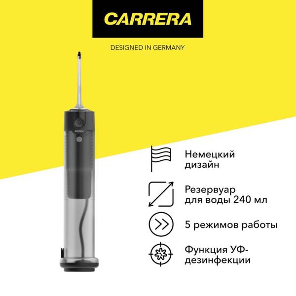 The Carrera CRP106 Black water flosser provides superior oral hygiene, effectively cleaning between teeth with a pulsating water jet reaching up to 1600 pulses per minute and 896 kPa pressure. Its integrated UV sterilization function ensures extra hygiene by preventing bacterial growth. The 240ml reservoir is ample for a thorough cleaning. Choose from five operational modes – Child, Gentle, Standard, Intense, and Pulsating – to customize the water pressure to your needs and preferences. Enjoy up to three months of daily use on a single charge, making it ideal for home and travel. Includes three 360° rotating nozzles with metallic tips: a daily care nozzle, a gum care nozzle, and a specialized orthodontic nozzle for braces, ensuring versatility for all users. The intuitive control panel features clear indicator lights for active modes.