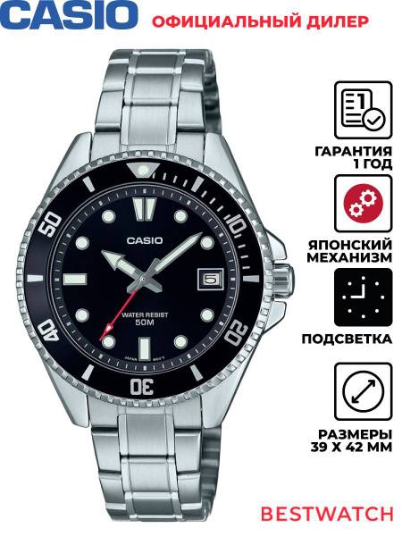 The Casio MDV-10D-1A1 is a classic men's analog watch boasting a durable stainless steel case and bracelet. This water-resistant (50m/165ft) timepiece features luminous hands and markers for excellent low-light visibility, a date display, and a precise quartz movement with a 3-year battery life. Its sleek black dial, 39mm case diameter, and comfortable design make it a versatile choice for everyday wear. Experience reliable timekeeping with the Casio MDV-10D-1A1.