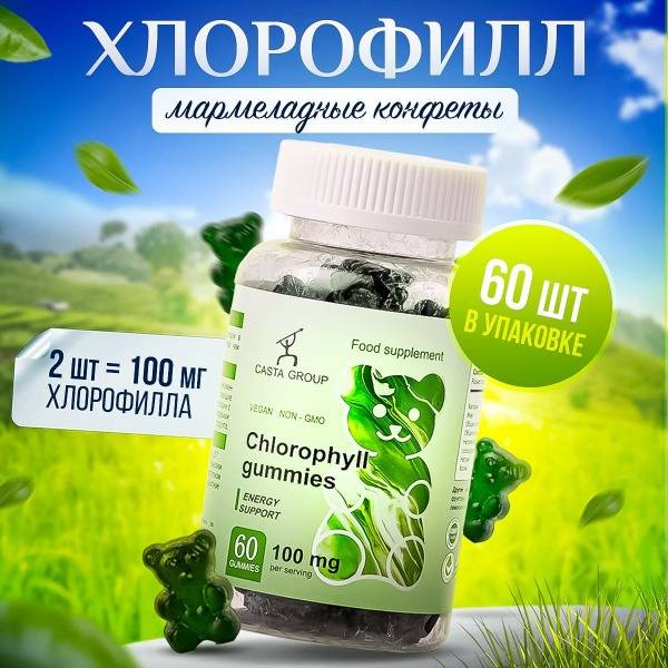 Enjoy delicious gummy bears while supporting your health and wellbeing! Casta Group's chlorophyll gummy bears deliver a potent dose of liquid chlorophyll, a powerful plant-based nutrient known for its immune-boosting and detoxifying properties. This certified, GMO-free, vegan-friendly supplement helps cleanse the intestines, strengthen connective tissues, improve eye health, and promote healthy hair growth. Chlorophyll aids in fat metabolism, making it a beneficial addition to weight management plans and pre-workout routines. Suitable for men, women, and children (6+), these gummy bears are a delicious and convenient way to boost your daily vitamin intake and support overall wellness. Contains 60 gummies. Not a drug.