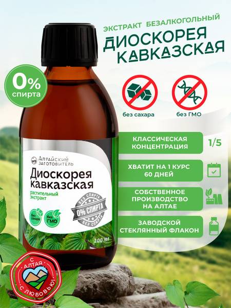 Keywords: Caucasian Dioscorea, Dioscorea extract, alcohol-free, cholesterol support, cardiovascular health, heart health, women's health, hormonal balance, immune support, joint health, natural remedy, herbal remedy, atherosclerosis, cardiopathy, rheumatoid arthritis, phytoestrogens, saponins, glycosides, 200ml