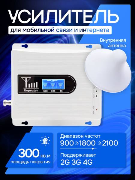 Keywords: cell phone signal booster, 2G booster, 3G booster, 4G booster, 900 MHz booster, 1800 MHz booster, 2100 MHz booster, mobile signal amplifier, cellular repeater, signal repeater, home signal booster, office signal booster, weak signal solution, 11 dBi antenna, 15 meter cable, MTS, Beeline, Megafon, Tele2, Yota, 300m2 coverage, improved cell phone reception, high-speed mobile internet.