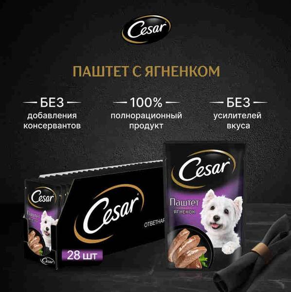 Indulge your dog with Cesar Adult Dog Wet Food Pate with Lamb. This delicious pate, topped with a delicate layer of flavorful jelly, is crafted with love and care using high-quality ingredients. Free from artificial colors, flavors, and preservatives, it provides a complete and balanced meal, offering a source of essential moisture, particularly beneficial for smaller breeds. The exquisite taste will satisfy even the most discerning palates. Feeding guide (adult dog weight in kg - pouches per day): 3kg - 4; 4kg - 5; 6kg - 6-7. Serve at room temperature and always provide fresh water.