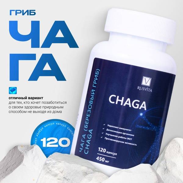 Boost your health naturally with GHAGA Birch Chaga Mushroom Supplement. Each bottle contains 120 easy-to-swallow capsules, each providing 450mg of potent Chaga extract sourced from ecologically clean regions. Known for its immune-supporting properties, Chaga helps strengthen your overall well-being. This powerful supplement supports a healthy metabolism, promotes healthy digestion, and acts as a potent antioxidant, neutralizing free radicals and protecting cells from damage. Perfect for busy lifestyles, our Chaga capsules require no special storage conditions. Whether you're looking to bolster your immunity during cold and flu season, improve your overall health, or simply incorporate a natural, beneficial supplement into your daily routine, GHAGA Chaga offers a powerful and convenient solution. Discover the amazing benefits of Chaga—order yours today!
