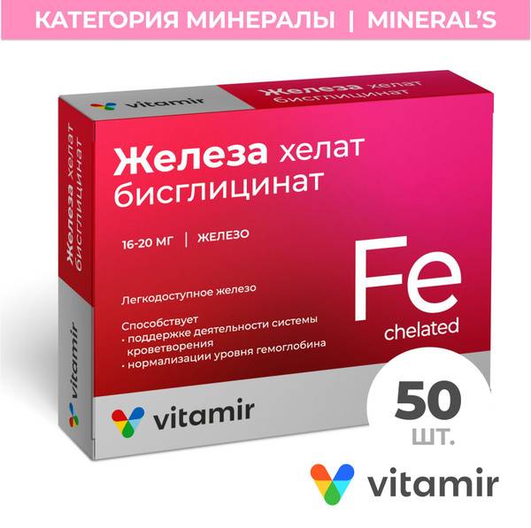 Keywords: chelated iron, iron supplement, heart health, vascular health, iron deficiency, bisglycinate iron, organic iron, iron absorption, VitaMir, dietary supplement, oxygen delivery, blood production, energy production, cardiovascular support, tablets, 50 tablets.