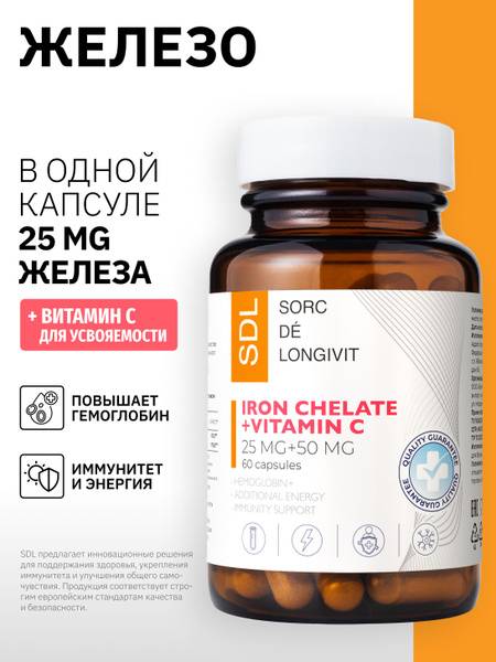 Experiencing headaches, fatigue, morning sluggishness, cold sensitivity, nervousness, emotional instability, memory problems, brittle hair and nails, dull skin, bluish lips, rapid heartbeat, or changes in taste and smell? These could be signs of iron deficiency, affecting 30-40% of the Russian population. Iron deficiency often leads to anemia (low hemoglobin). SDL sorc dé longivit's Iron Chelate + Vitamin C is designed to address this common issue. Developed by a team of practicing physicians, this formula uses bisglycinate iron – one of the most bioavailable forms – combined with vitamin C to enhance absorption and provide numerous benefits: