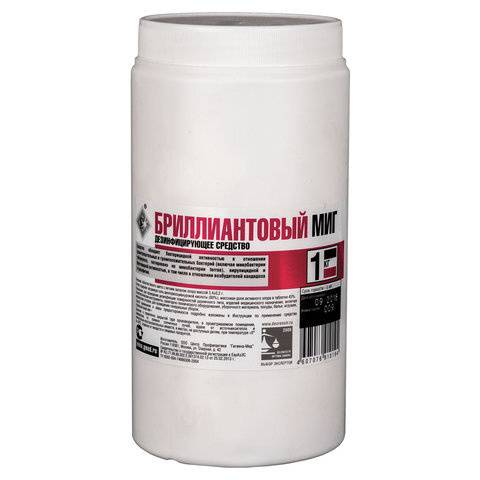 Brilliantovy Mig chlorine tablets (1kg, 300 tablets) provide powerful disinfection for various applications. Effective against bacteria (including tuberculosis), viruses (including Hepatitis, Polio, HIV, and Influenza), and pathogenic fungi. Suitable for prophylactic and focal disinfection of surfaces, linens, medical instruments (including low-carbon steel, nickel-plated metals, rubber, glass, and plastics), tableware (with or without food residue), and more. Ideal for use in healthcare facilities, laboratories, communal areas (hotels, hostels, baths, laundries, swimming pools, hair salons), food service establishments, and for final disinfection in childcare and correctional facilities. Contains 80.5% sodium dichloroisocyanurate and auxiliary substances (adipic acid, sodium carbonate, and sodium bicarbonate). Active chlorine content: 44%.