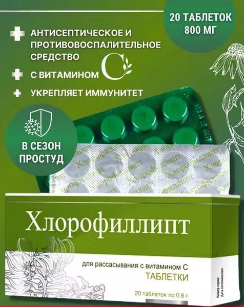 Keywords: Chlorophyllipt, Vialine, Vitamin C, immune support, throat relief, antiseptic, anti-inflammatory, antiviral, Eucalyptus globulus, Echinacea pallida, immune boosting, natural remedy, herbal supplement, bacterial infection, fungal infection, cold and flu, sore throat, herpes, furunculosis, dietary supplement, immune system, health supplement, Vifitech CJSC, 800mg, 20 tablets.