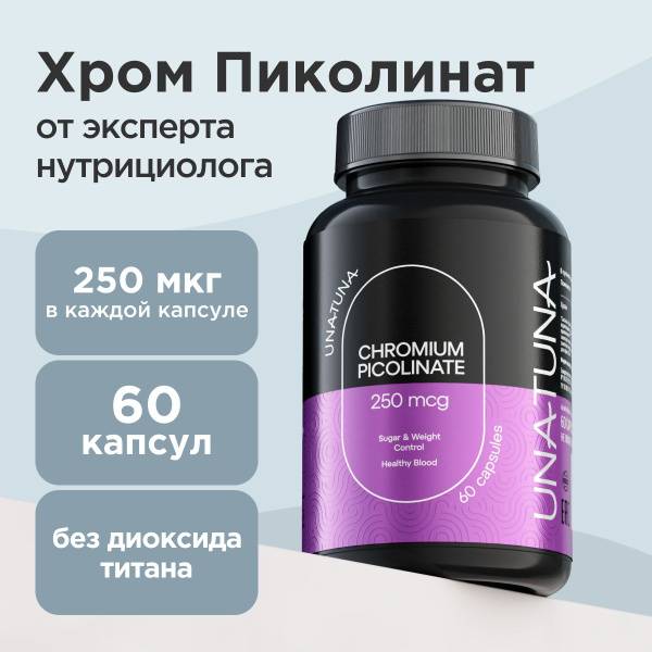UnaTuna Chromium Picolinate is a dietary supplement supporting heart health, weight management, and healthy cholesterol levels. This potent formula helps control appetite, regulate blood sugar, and improve brain function. Chromium picolinate aids in weight loss by reducing cravings for sweets and processed foods, boosting fat burning during exercise, and increasing satiety. It's also effective in preventing diabetes by improving insulin sensitivity. This supplement supports cardiovascular health by contributing to healthy cholesterol levels and protecting against plaque buildup. Beneficial for both men and women, UnaTuna Chromium Picolinate promotes muscle growth, aids post-workout recovery, and replenishes chromium stores depleted through intense physical activity. It also supports nervous system health, combating fatigue, anxiety, and improving mood and sleep quality. Experience increased energy, improved focus, and reduced migraines. UnaTuna Chromium Picolinate is a safe and effective supplement, ISO 22000 certified, with a clean formulation free of titanium dioxide. Each capsule contains 250 mcg of chromium picolinate; the recommended daily dose is one capsule (250 mcg) for optimal chromium levels.