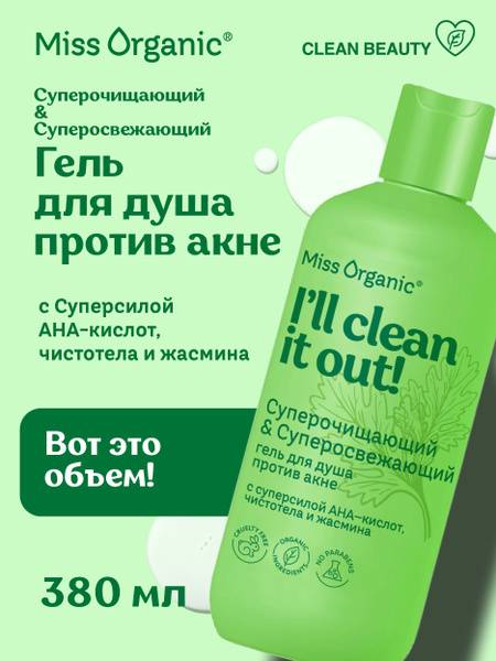 Clean It Out AHA Shower Gel by Miss Organic is your superhero solution for blemish-prone and combination skin. This refreshing, fragrant shower gel harnesses the power of AHA acids and silver citrate to combat acne, reduce inflammation, and unclog pores. Say goodbye to breakouts on your back, chest, and areas prone to ingrown hairs. The gentle formula, enriched with soothing calendula and jasmine essential oil, effectively cleanses without over-drying, leaving your skin feeling soft, smooth, and revitalized. Perfect for daily use in the shower, bath, or even on the go, Clean It Out is suitable for both men and women. Experience the transformative power of nature's ingredients: calendula for purity and mattifying effects, AHA acids for cell renewal, and jasmine for luxurious softness. Simply apply to wet skin, lather, and rinse. Suitable for everyday use. For external use only. Keep out of reach of children. In case of eye contact, rinse thoroughly with water. Individual intolerance to components is possible. Store at temperatures between 0°C and +25°C. 380ml.