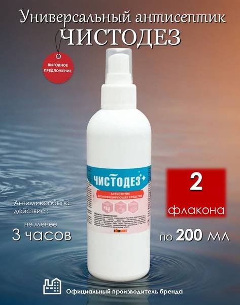 Chistodez Universal Skin Antiseptic is a powerful, alcohol-based solution for disinfecting both skin and surfaces. Developed jointly by Chistovoye and Polisept, it offers effective disinfection in just 30 seconds. Safe for various surfaces, it won't damage finishes, discolor fabrics, or corrode metals. Enjoy a pleasant, odorless experience. Ideal for preventative disinfection in a wide range of settings including: hair and beauty salons, hotels, hostels, medical facilities, bathhouses, saunas, laundries, tanning salons, swimming pools, and fitness centers.
