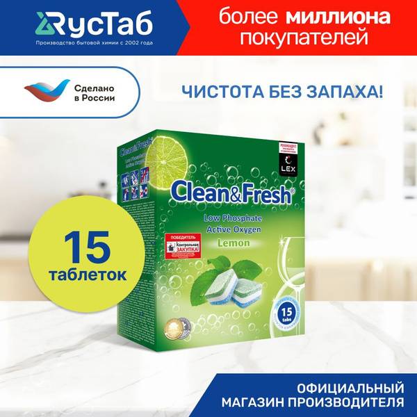 Experience sparkling clean dishes every time with Clean & Fresh All-in-1 Dishwasher Tablets. These high-quality tablets from a leading Russian household chemical manufacturer deliver superior cleaning power, effortlessly removing even stubborn stains and saving you valuable time. Our advanced formula includes protective agents to safeguard your dishwasher's components.