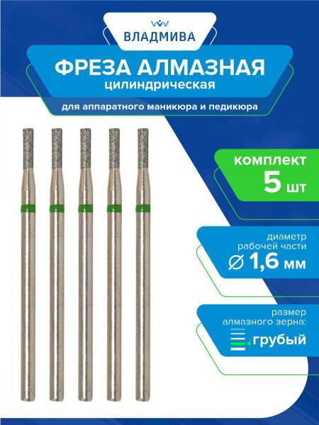 This 5-piece set features high-quality diamond cylinder burs with a coarse grit, measuring 1.6mm in diameter. These burs are expertly crafted for professional hardware manicure and pedicure applications by TD "VladMiVa". Ideal for nail sculpting, design, and correction, they also excel at efficiently treating rough skin.